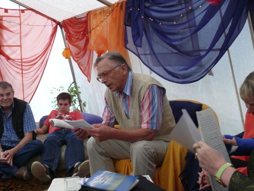Lenz liest beim Edersee-Kulturfest im Literaturzelt aus dem Buch ‚Pfarrer Meerhammers Schäfchen’ (August 2010).